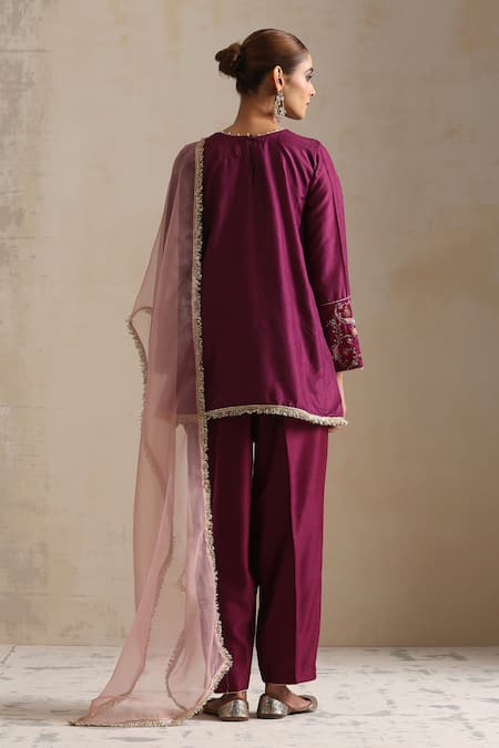 Aubergine purple full sleeves short kurta featuring blossom embroidery. Paired with a pant and a lace border embellished light pink dupatta.
