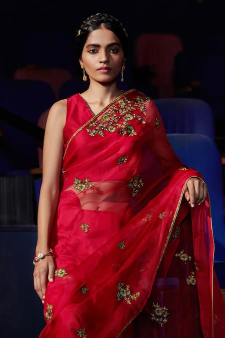 Berry silk organza saree with thread embroidered floral motifs. Paired with sleeveless silk chanderi blouse.