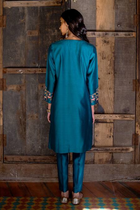 Teal silk chanderi kurta with thread embroidery. Comes with cigarette pant and a coral silk organza dupatta.
