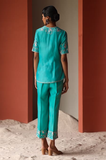 Turquoise silk chanderi jacket featuring mirror and thread embroidery with a V neck and half sleeves. Paired with wide legged pants that also feature embroidery at the hems.