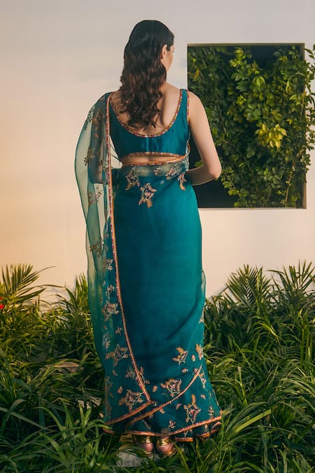 Teal silk organza saree featuring all-over thread embroidery. Paired with a sleeveless silk chanderi blouse adorned with similar embroidery.
