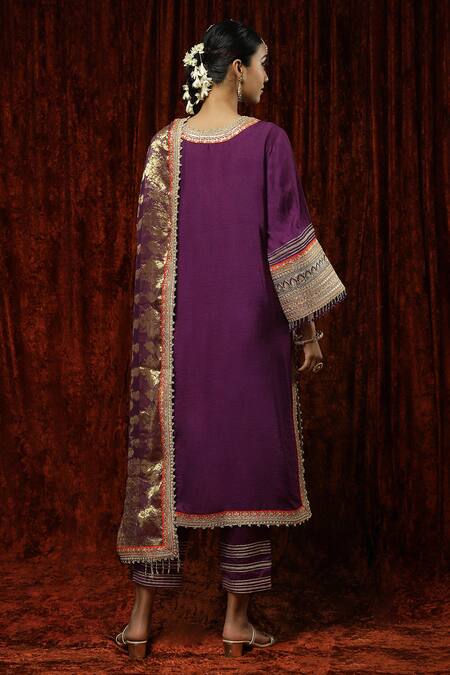 Purple kurta made from silk chanderi featuring intricate badla, kasab, and pearl work. Paired with matching silk chanderi pant and a floral dupatta adorned with gota, dori, and crystal drop detailing.