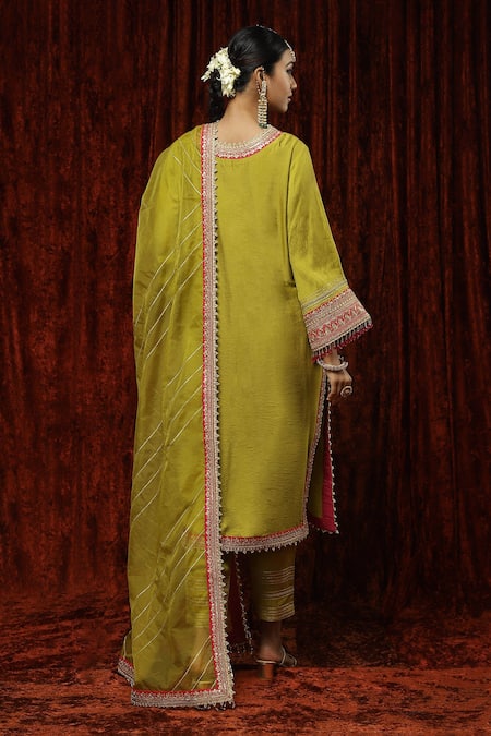 Green embroidered kurta featuring a V neck and full sleeves. Paired with matching pants and an organza dupatta adorned with gota, dori, and crystal drop detailing.