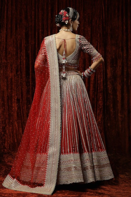 Red Silk, Chanderi, Net Beads, Embroidery, Gota Embellished Bridal Lehenga Set