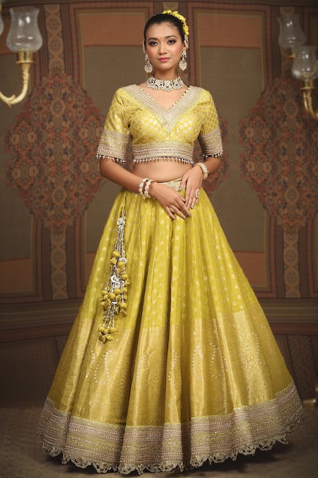 Lemon green lehenga featuring paisley and floral banarasi woven motifs with gota, dori, and badla embroidered borders. Paired with a neckline embroidered padded blouse and a scallop embroidered dupatta.