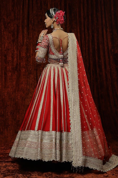 Red lehenga featuring gota, dori, badla, and zari embroidery in stripe pattern. Paired with a checkered embroidered padded blouse and scallop border embroidered dupatta.