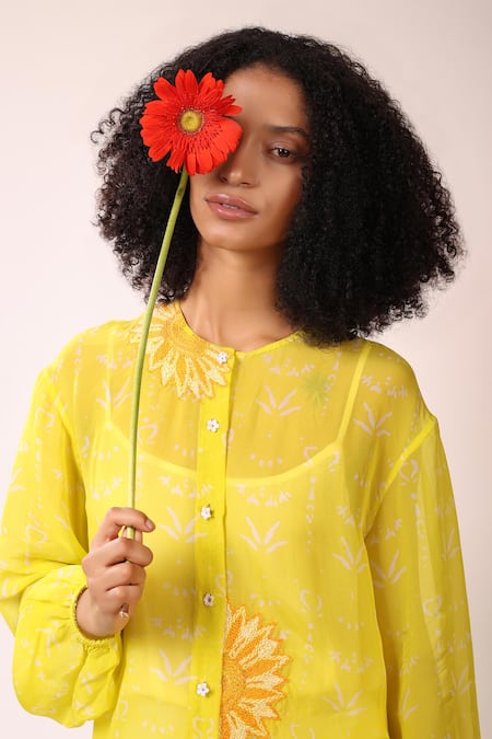 Buy_Shilpi Gupta_Yellow Satin Organza Embroidery Abstract Block Sheer Print Shirt With Trouser _Online_at_Aza_Fashions