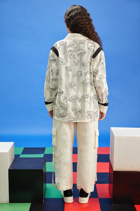 Ivory Cotton Sequins Collared Abstract Figurine Embroidered Shirt