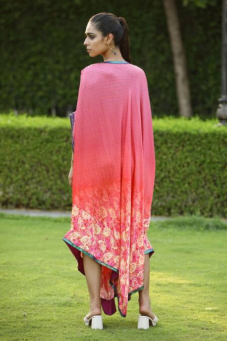 Buy_Shilpi Gupta_Coral Modal Satin Floral, Boota Patch V Neck Print Kaftan Tunic_Online_at_Aza_Fashions