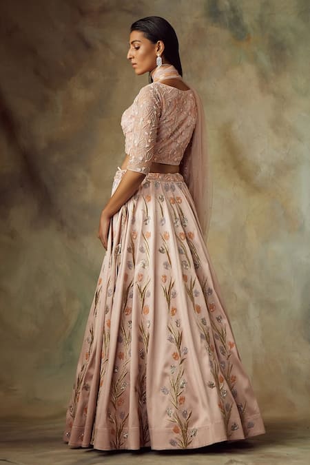Peach sandwash satin lehenga featuring hand embroidered tulips with resham, cutdana, and sequins. Paired with a blouse and a dupatta, showcasing sheer sleeves.