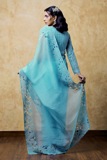 Aqua blue organza saree featuring intricate cut-work detailing and embroidery. Paired with a matching embroidered blouse with a boat neckline and full sleeves.