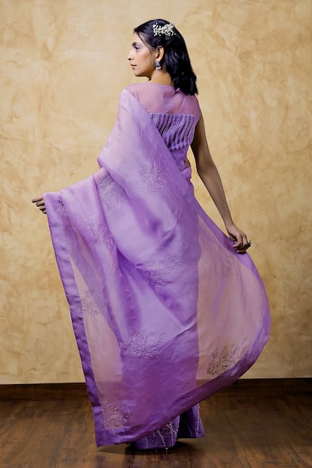 Purple Organza Beads, Embroidery Round Neck Saree With Frill Detail Blouse