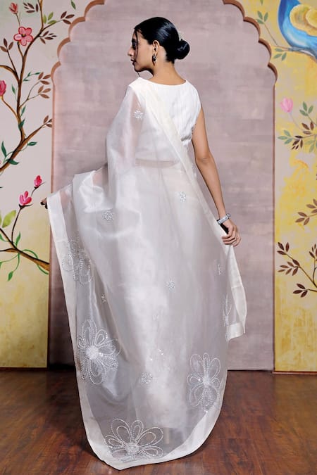 Red organza saree featuring glass cut-dana and beads embroidery on the borders. Paired with a square neck embroidered blouse.