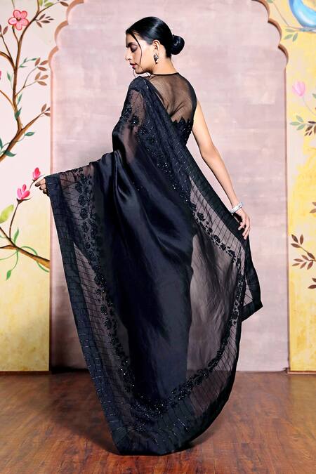 Black organza saree featuring intricate glass cut-dana and bead work detailing. Paired with a sleeveless embroidered blouse with a round neckline.