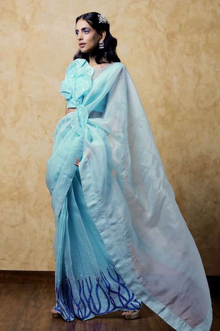 Blue Organza Embroidery, Cut Work Round Neck Saree With Floral Detail Blouse
