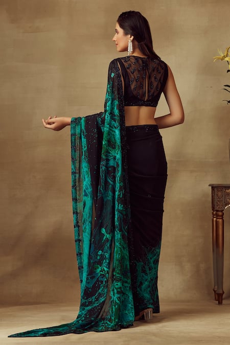Black saree with a blue printed border and tonal bead embroidery. Comes with a sleeveless blouse.