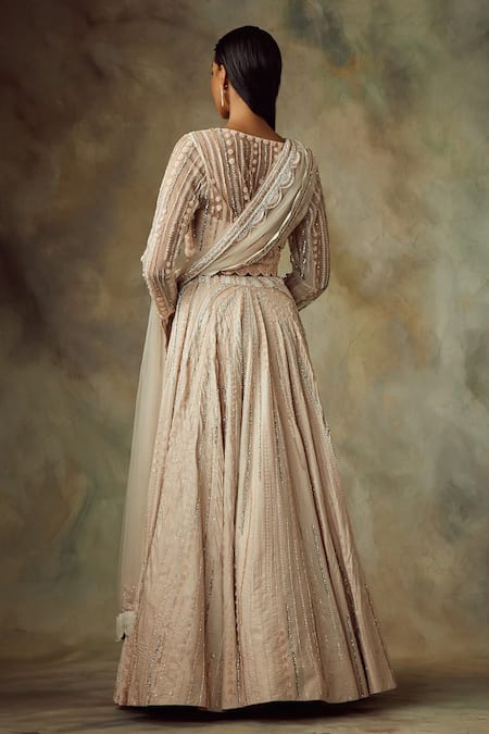 Beige lehenga in hammer satin featuring resham, cutdana, and sequins embroidery. Accompanied by a matching blouse and dupatta with sheer neckline and sleeves.