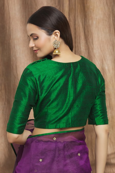 Bottle green saree with round neckline & side zip closure.