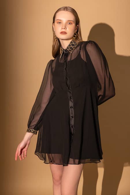 Black Silk, Georgette Cut Work Collared Embroidered Dress