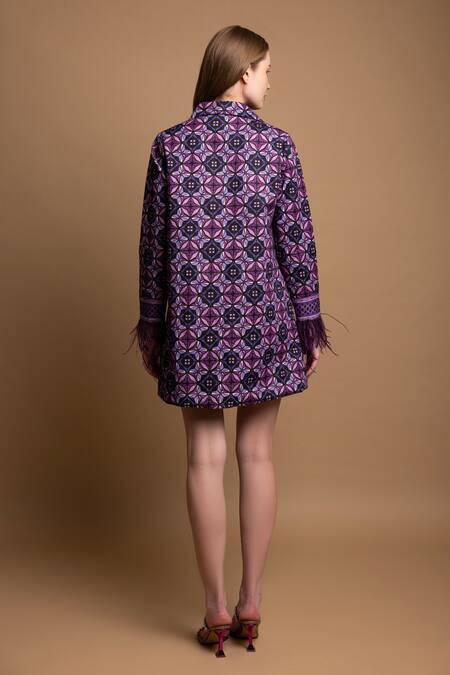 Purple cotton satin dress featuring a collar neckline and full sleeves with abstract print