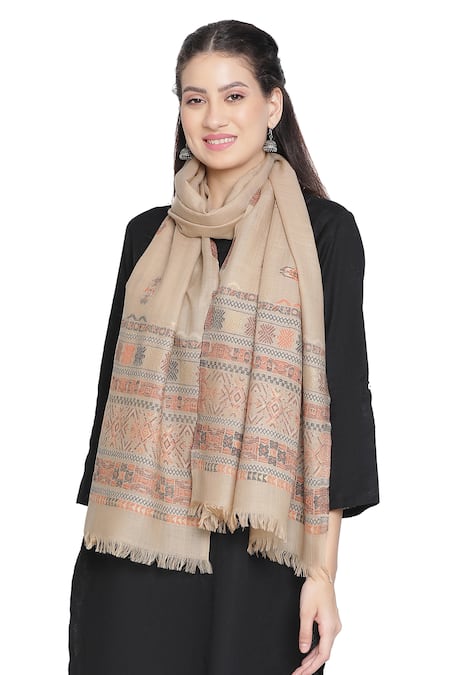 Woven geometric patterns with metallic threads, Fringed edges for added texture