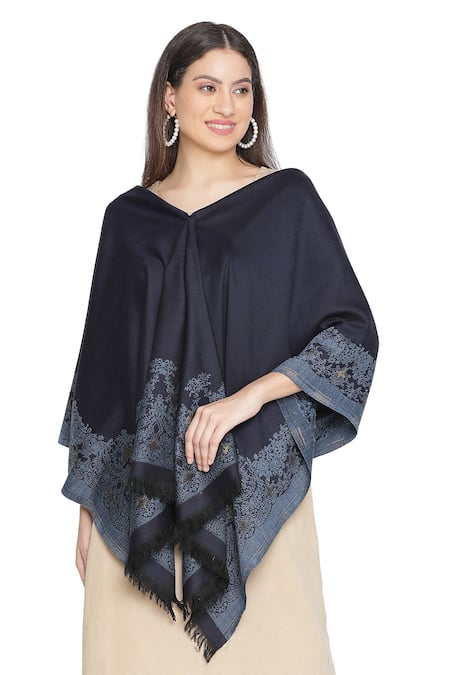 Navy blue shawl made from 100% wool featuring floral woven patterns and frayed edges