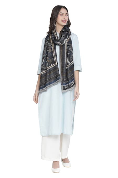 Black stole featuring floral and geometric jacquard woven motifs with fringe borders