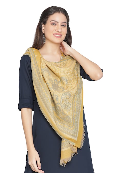 Yellow woven stole featuring a paisley pattern and a frayed hem