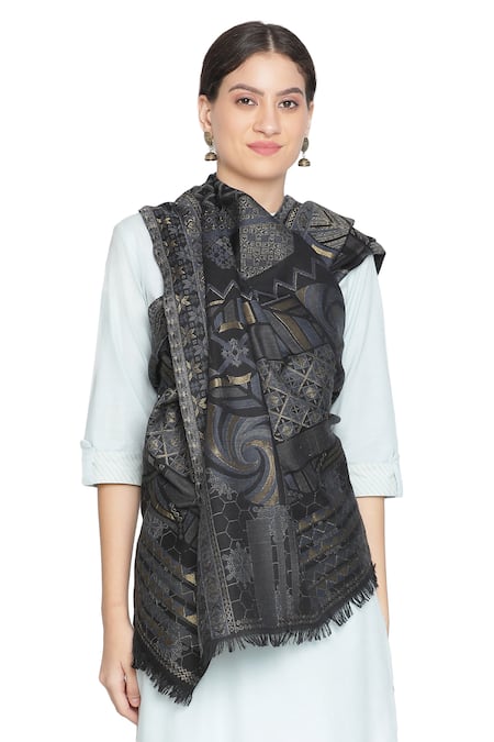 Black woven stole featuring an all-over geometric fleur pattern with thread tassel border detailing