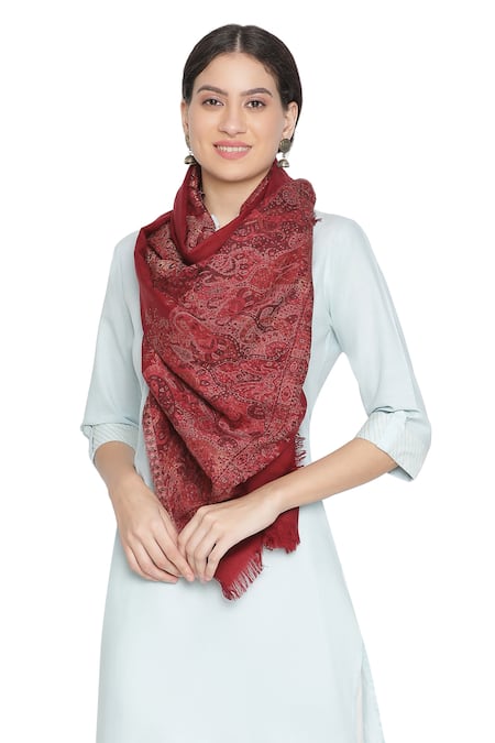 Maroon woven stole featuring a timeless paisley garden paradise pattern