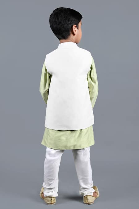 Light green kurta set featuring a full sleeve curved hem kurta, paired with a sleeveless bundi adorned with bird art. Accompanied by a matching pyjama for a complete look.