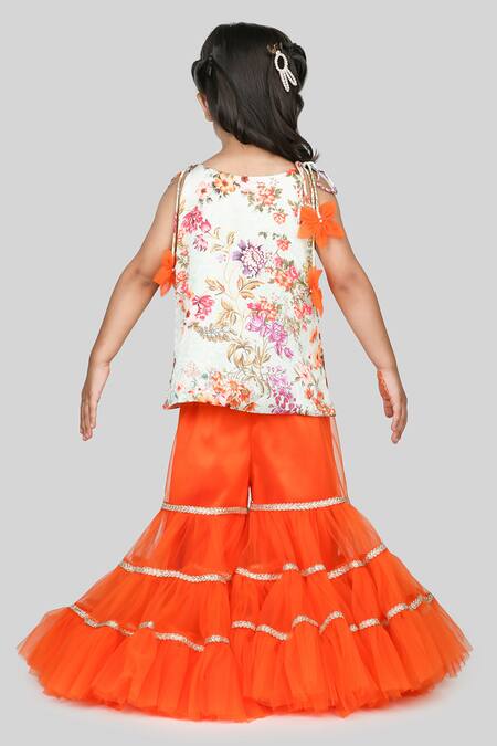 Sea green tie-up sleeveless kurta featuring an all-over blossom print. Paired with an orange tiered net sharara adorned with gota lace highlights.