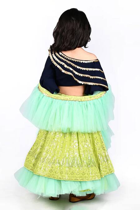 Navy blue one shoulder blouse featuring bell sleeves and sequin coin embellishments. Paired with a lime green lehenga adorned with brazen sequin rays embroidery and a ruffled net dupatta.