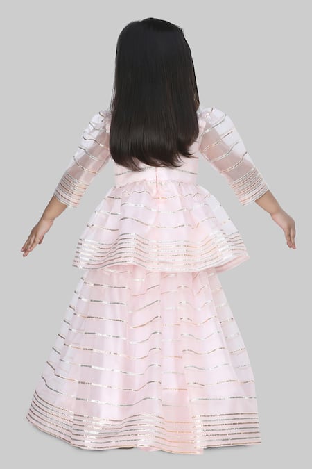 Light pink flared lehenga featuring all over gota striped embellishments. Paired with a puffed sleeves gota striped peplum style blouse and flora sequin embellished dupatta.