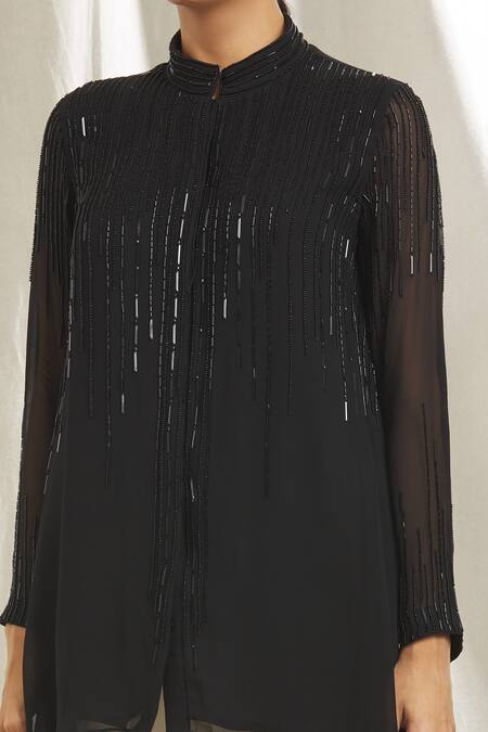 Black tunic featuring a mandarin collar and full sleeves with crystal and sequin embellishments