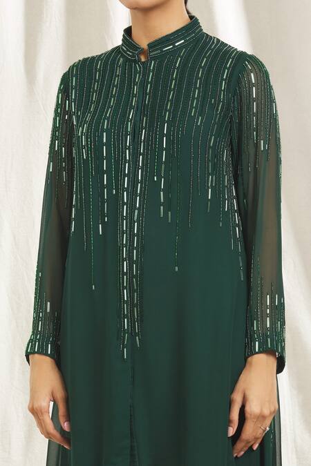 Green Georgette Crystals, Sequins Mandarin Collar Embellished Asymmetric Tunic