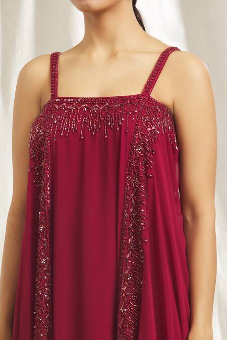 Maroon tunic featuring a square neckline and sleeveless design with crystal and sequin embellishments