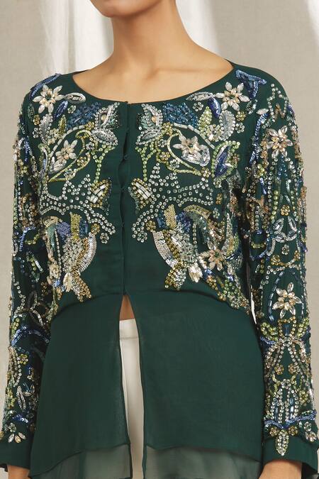 Bottle green tunic featuring crystal and sequin embellishments with a high-low hem
