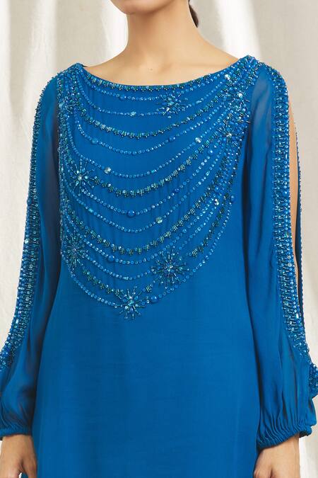 Blue Georgette Sequins, Beads, Crystals Boat Neck Embroidered Tunic