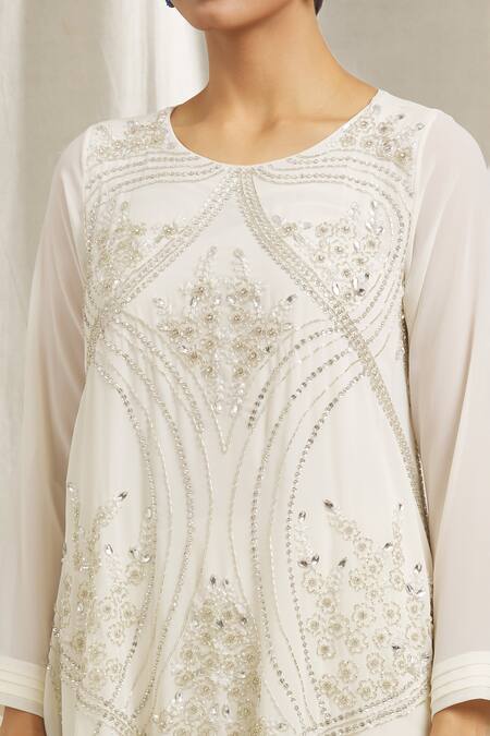 Ivory georgette tunic featuring a high-low hem with all over floral abstract pattern and intricate hand embroidery. Paired with wide-legged pants that have a side concealed zip closure.