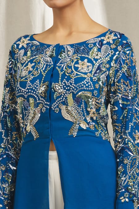 Blue tunic featuring crystal and sequin embroidery with a high-low hem