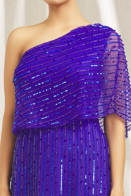 Blue Tulle Sequins, Beads, Cut Work One Shoulder Embroidered Maxi Dress