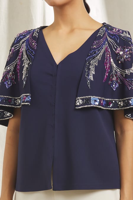 Blue top featuring a V-neckline and flared sleeves with crystal and sequin embellishments