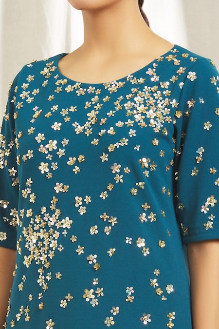 Teal dress featuring scattered floral sequin embroidery and a round neckline