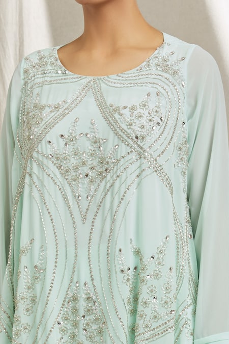 Mint georgette tunic featuring high-low hem and all-over floral abstract pattern with hand embroidery, beads, stones, cut dana, and sequins. Paired with wide-legged pants with a side concealed zip closure.