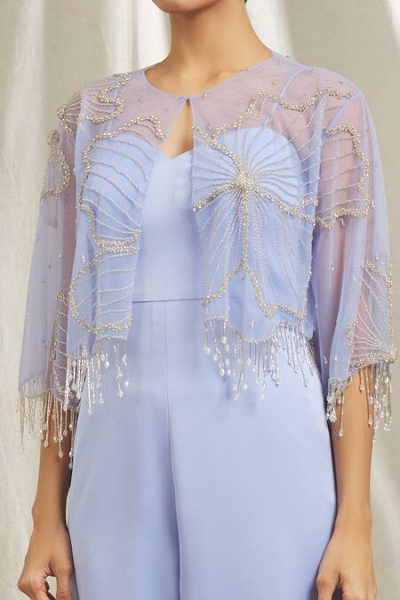 Blue Tulle, Crepe Beads, Crystals, Cut Solid Jumpsuit With Embroidered Cape