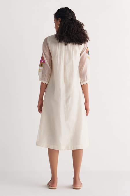Ivory chanderi dress featuring floral applique embroidery and sheer sleeves