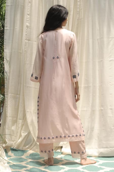 Baby pink kurta with floral embroidered motifs & flared sleeves. Paired with pant & dupatta.
