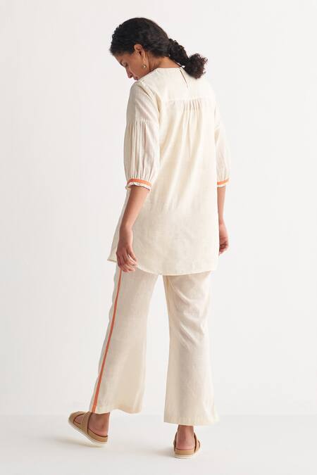 Off white long top featuring contrast orange floral cross-stitch embroidery. Paired with matching pants for a coordinated look.