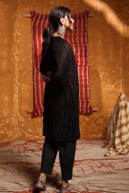 Black crinkled kimono kurta featuring embroidered button detailing on the neckline. Paired with a matching pant and attached lining for comfort.
